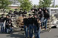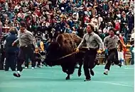 All subsequent Ralphies have also been donated to the university.[5] Ralphie II debuted before the second half of the final home game in 1978, after Ralphie I ran for the final time before the game. In 1986, Oklahoma State pranksters snuck into their college’s veterinary clinic and sprayed painted “OSU” on Ralphie's back in orange letters. On September 19, 1987, Ralphie II unexpectedly died the night after she ran during a game.[8] Ralphie III was already preparing to take over in 1988, but was pressed into action sooner than anticipated.[9] She became the first Ralphie to wear the blanket around her body. Ralphie IV was abandoned by her herd and attacked by a coyote before being rescued and donated to the university. Ralphie V was known as the most powerful and fastest of all the Ralphies. Ralphie VI was introduced to the public in 2021 at just 15 months of age and 500 pounds.[10]