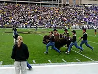 While commonly referred to as a buffalo, Ralphie is actually an American bison.[2] Due to their smaller size, reduced strength, and less-aggressive temperament, female bison have always been chosen as Ralphie as opposed to males.[3] She can reach speeds of 25 miles per hour, and it traditionally takes five handlers to guide her around the field. The team of approximately 15 "Ralphie Handlers" are student-athletes that earn varsity letters for their efforts. They spend more than 20 hours per week training, practicing, and caring for Ralphie, while rotating the privilege of running with her at the games.[4]