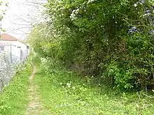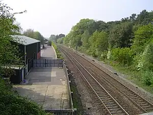 The South Wales Main Line was re-routed following the opening of the Severn Tunnel in 1886. The new route was established in 1903 with the building of what is often known as the Badminton Line.[8] This involved the construction of about 33 miles of new track, part of which skirted Ram Hill and Coalpit Heath. The Great Western Railway purchased the land at the Ram Hill Colliery site in 1898 and a deep railway cutting was created immediately north of the former mine.[9] To the west the Coalpit Heath Railway Station was opened and goods yard sidings established. The station fell victim to Dr Beeching's cuts and was closed in the 1960s.