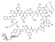 The biosynthesis is performed by a 33-gene cluster containing nonribosomal peptide synthetase genes and supporting enzymes for amino acid and fatty acid synthesis, revealed by sequencing of the producer strain in 2002. Initial investigation into the functions of individual genes were conducted in 2012.[9]