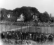 Rampokan was a traditional Javan big cat fight. Panthers or tigers were released from wooden boxes and surrounded by warriors with lances trying to prevent them from breaking out of the circle. The rampokan would take place towards the end of Ramadan. It symbolized purification and the overcoming of evil.[1] If the tigers and panthers succeeded in breaking through the circle, it was seen as an omen of disaster as famine. The ritual died out in the early 20th century.[2] A battle between a tiger and buffalo was the first part of the event in its earlier incarnations, but in later years this was omitted.[1]