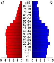 In the county, 25.60% of the population was under the age of 18, 11.30% from 18 to 24, 30.70% from 25 to 44, 20.70% from 45 to 64, and 11.60% was 65 years of age or older. The median age was 34 years. For every 100 females there were 93.00 males. For every 100 females age 18 and over, there were 89.20 males.