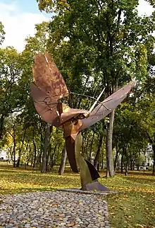 The cemetery had 37 known tombs of military aviators. Their headstones featured metal crosses shaped as airplane propellers.[8] A mausoleum dedicated to Stasys Girėnas and Steponas Darius, Lithuanian aviators who died in 1933 attempting a transatlantic flight from New York to Kaunas, was constructed by architect Vytautas Landsbergis-Žemkalnis.[8] It was meant as a temporary measure until the Christ's Resurrection Church was completed. On 1 November 1937, bodies of Girėnas and Darius were moved to the mausoleum.[39] In 1941, during World War II, their bodies were removed to the Faculty of Medicine of Vytautas Magnus University and hid in 1944. They were buried in Šančiai in 1964.[39] The mausoleum was demolished in 1959.[8] Its underground crypt survived and was excavated in 1996. There were plans of reestablishing a memorial to the pilots,[38] but the crypt was buried again in 2004.[8]