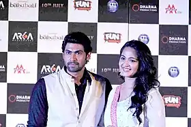 In 2015, he starred in the Hindi film Baby, alongside Akshay Kumar and Taapsee Pannu. Rana played Bhallaladeva, the cousin of Baahubali (Prabhas), in the 2015 film Baahubali: The Beginning, which is part of Baahubali franchise. His character became widely popular[52] and received unprecedented appreciation from critics.[53] Rana was inspired by Daniel Day-Lewis to play the character.[54] He described the film as "career-defining" for him.[55] Baahubali: The Beginning was released worldwide in July 2015 and was the highest-grossing film in India at the time of its release.[56] Made on a production budget of ₹ 180 crore,[57] the film collected a worldwide gross of ₹650 crore at the box office.[58] The film gave him several awards, including the Nandi Award for Best Villain and SIIMA Award for Best Actor in a Negative Role (Telugu). The film started a new film movement named Pan-India films. He next appeared in the film Rudhramadevi.[59] It is a 3D biographical action film based on the life of Rudrama Devi,[60] in which he played the role of Chalukya Veerabhadra.[61] Although, the film didn't performed well at the box-office, it received mixed reviews from the critics.[62][63] Pranita Jonnalagedda felt that his character in the film is "underused".[64] The same year, he appeared as himself in a cameo role in Dongaata (Telugu),[65] Size Zero (Telugu)[66] and Inji Iduppazhagi (Tamil).[67]