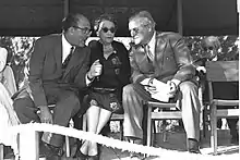 Randolph was ordered by Maclean to take charge of the military mission in Croatia.[104] By September he was back in Yugoslavia, where Waugh recorded that he was drunk most days, needed to have things repeated back to him when sober, and behaved awfully even when sober. Waugh described him as "a flabby bully who rejoices in blustering and shouting down anyone weaker than himself and starts squealing as soon as he meets anyone as strong—he is a bore—with no intellectual invention or agility. He has a childlike retentive memory, and repetition takes the place of thought. He has set himself very low aims and has not the self-control to pursue them steadfastly." Lovell wrote that every observer, including Duff Cooper and Anita Leslie, recorded frequent "drunken ranting" from him at this period. On good days he could be excellent company.[100] With Waugh he established a military mission at Topusko on 16 September 1944.[106] One outcome was a formidable report detailing Tito's persecution of the clergy. It was "buried" by Foreign Secretary Anthony Eden (who also attempted to discredit Waugh) to save diplomatic embarrassment, as Tito was then seen as a required ally of Britain and an official "friend".[107][108][109]
