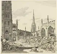 In 1941 Schwabe joined the committee of the War Artists' Advisory Committee and was also given a short commission to produce pieces for their collection.[10] This included a commission to record the bomb damage to Coventry Cathedral in November 1940.[11] In 1942 Schwabe was elected a member of the Royal Society of Painters in Watercolours, having been elected an associate of the Society in 1938.[12] A columnist for the Chicago Daily Tribune nominated Schwabe for a Pulitzer Prize in 1943 for his cover illustration to The Old Churches of London by Gerald Cobb but had to write to the book's publishers to explain that he had been humorous as no such prize existed.[13]