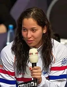 Ranomi Kromowidjojo (Dutch pronunciation: [raːˈnoːmi ˌkroːmoːʋiˈɟoːjoː]; born 20 August 1990) is a retired Dutch swimmer[1] of mixed Dutch-Javanese Surinamese origin who mainly specialises in sprint freestyle events. She is a triple Olympic champion, winning the gold medal in the 4 × 100 m freestyle relay at the 2008 Olympics, and in the 50 m freestyle and 100 m freestyle at the 2012 Olympics. Kromowidjojo holds the world record in the 50 meter freestyle short course (25 m pool), and as part of the Dutch team she holds the world record in the 4×50 m freestyle relay (short course). She formerly held world records in the 4 × 100 m and 4 × 200 m freestyle relays (short course).[2] She has won a total of 39 medals in FINA World Championship events.