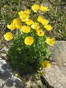 Ranunculus montanus, called the mountain buttercup along with other members of its genus, is a species of flowering plant in the family Ranunculaceae, native to the mountains of central and south-central Europe, with perhaps some populations in the Republic of Karelia in Russia.[1] Its cultivar 'Molten Gold' has gained the Royal Horticultural Society's Award of Garden Merit.[2]