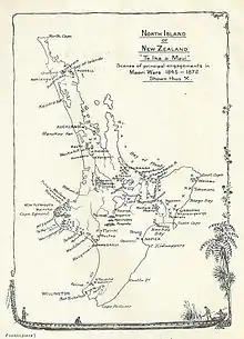 Map of the North Island of New Zealand, showing sites of key battles during the conflicts of the 1840s to 1870s