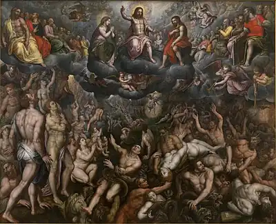 The only work that can be attributed to him with certainty is the Last Judgement that he painted in the period 1588-89 for the Ghent city magistrate. It hangs now in the Museum of Fine Arts in Ghent. The composition of the painting is quite traditional. Christ is seated on a cloud and surrounded by saints and angels. On the left the blessed are kneeling down while on the right the damned are dragged to hell by satyrs and monsters. The painting incorporates a crouching figure inspired by the statue of the Crouching Venus by the famous Greek sculptor Doidalses. The life-size nudes at the bottom left of the panel are reminiscent of Michelangelo, while the upper part representing heaven calls to mind Raphael's work.[3]