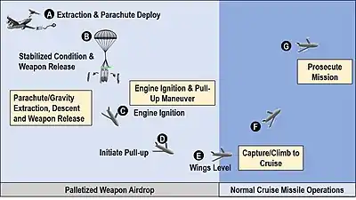 - The concept of loading and launching palletized missiles from American cargo aircraft was first explored by graduate students in preliminary concept studies at the Air Force Institute of Technology in 2003 with explored launch systems including cruise missiles deployed from the aft of the aircraft atop of parachuted pallet trays, ejected rearwards from rotary launchers, or ejected rearwards from spring-loaded launchers.[14] Later in the 2010s, with the emergence of near-peer adversaries exploring anti-access area denial tactics to counter the United States military's aerial and naval power projection capabilities, other research institutions such as the RAND Corporation began exploring concepts that may extend standoff bombing capabilities for the US military while balancing Congressional budgetary restraints.[15] Similar concepts for parachuting pallets from cargo aircraft to launch rockets have independently been proposed in the civilian aerospace sector by a cross-industrial team sponsored by the Japanese Ministry of Economy, Trade and Industry in 2011 at the 25th AIAA/USU Conference on Small Satellites to facilitate the deployment of satellites weighing 100-200 kilograms to Low Earth orbit without the need for a dedicated spaceport.[16] Follow-up design research was published in 2013 and 2015 at the 27th and 29th AIAA/USU Conferences on Small Satellites respectively. These design proposals have also been preceded and paralleled with other related Air-launch-to-orbit concepts that launch spacecraft deployed either from cargo ramps or external mounts.
