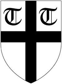 Arms of Rashleigh of Cornwall: Sable, a cross or between in the first quarter: a Cornish chough, argent beaked and legged gules; in the second quarter: a text "T"; in the third and fourth quarters: a crescent all of the third[2]