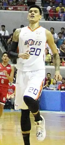 In the 2015–16 Philippine Cup, he posted career-highs of 21 points and 17 rebounds in a win over Meralco.[29] They made it to the semis against the Beermen, where before Game 3, he stepped on Jewel Ponferada's foot, spraining his right ankle.[30] Without him, Rain or Shine lost in 6 games.[31] In the 2016 Commissioner's Cup, he won his first championship, as his team won the Finals in 6 games.[32] He was on the Stalwarts team that won vs the Greats during the PBA All-Star Weekend that year.[33] Unfortunately, Rain or Shine couldn't keep that momentum going in the Governor's Cup, as they failed to make at least the quarterfinals.[34]