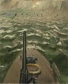 Early in World War II, Coxon offered his services to the War Artists' Advisory Committee, WAAC, and in particular volunteered to return to Palestine as a war artist.[6] That offer was refused but WAAC commissioned Coxon to produce some paintings of Army subjects in Britain, after which they purchased several other pieces from him.[7] Independently of WAAC, Coxon received commissions from the Royal Navy and Army that saw him spend time on a corvette on convoy duty, join a river patrol on the Thames and witness parachutists making training jumps. He also produced some fine portraits during the war, notably of the Victoria Cross recipient Pip Gardner and also a portrait of his own wife in her ambulance service uniform.[2]