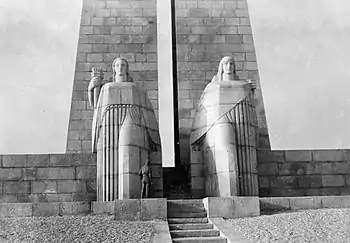 The monument's inauguration ceremony on 3 October 1937 was led by Maréchal Pétain. Jonnart came from Fléchin-en-Artois near to Saint Omar, and was regarded as one of the leading politicians of the Third Republic. He became a deputy for the Pas-de-Calais in 1889 and a senator in 1893, and both before and after the 1914–28 war, he led various ministries and participated to the full in French political affairs. Positions held by Jonnart included the presidency in 1907 of the Suez Canal Company and in 1911 he was Minister for Foreign Affairs and French Ambassador to the Vatican from 1921 to 1923. Elected to the Académie française in 1923. Delamarre was commissioned to carry out the sculptural work involved in this monument honouring Jonnart's memory and depicts Jonnart in a bronze bas-relief within a medallion, this set into a tall pedestal at the centre of the monument and beneath which, an allegory for France, carved from black granite, stands in defiant pose. Also on the central pedestal, Delamarre added an outline of the Saint-Pierre de Rome, the Arras belfry and the Parthenon.[5][28][29]