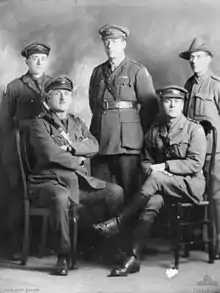 In July, he was mentioned in despatches for the eighth and final time.[12] In September he relinquished his duties at Hurdcott and embarked to return to Australia.[93] Leane was variously described by Bean in his Official History of Australia in the War of 1914–1918 as, "the head of the most famous family of soldiers in Australian history",[19] "the fighting general par excellence",[19] "the foremost fighting leader in the AIF",[94] "a particularly cool and forcible – and serious commander",[95] and a "great leader".[96] He had a reputation as "a considerate leader, with great strength of character and a high sense of duty. In action he was... unflappable and heedless of danger".[80] Of Leane's four brothers who served in World War I, two were killed. Six of his nephews also served, two of whom were killed. The Leanes became one of the nation's most distinguished fighting families, and were known as the "Fighting Leanes of Prospect".[80]