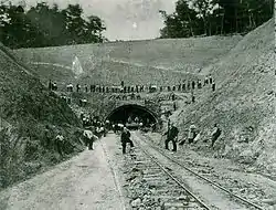 From the Turnpike's opening in 1940 until the realignment projects, the tunnels were bottlenecks due to reduced speeds with opposing traffic in the same tubes. Studies were completed for the remaining five mainline tunnels to determine the cost benefit of twinning of the tunnels, or complete bypass.[1] After the studies completed, the decision was made to go ahead with a US $100 million [lower-alpha 1][2] construction project to work with the tunnels. Construction began on September 6, 1962, with the first subproject being a bypass of the Laurel Hill Tunnel. On October 30, 1964, just two years after construction began, the Laurel Hill Bypass was completed and opened.
