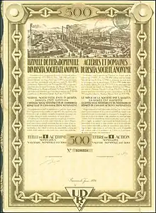 Share of the Reșița Works (Uzinele de Fier și Domeniile Reșița), issued June 1926