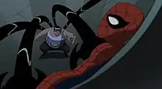 ![]() Dr. Octopus pins Spider-Man to the wall. Episode director Jennifer Coyle opined that "Those arms are amazing, and the timing has been really good for this show, so much so that I think you feel the impact of those arms."[1] | |