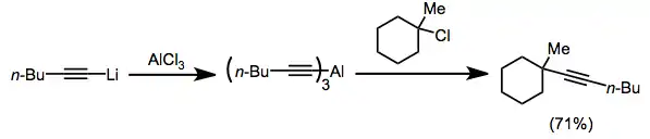 Alkynylalanes are primarily used in place of the corresponding alkali metal acetylides when the latter reagents are ineffective. The coupling of an acetylide and tertiary alkyl halide is an example of a reaction that cannot be accomplished with alkali metal acetylides, which displace halides in an SN2 fashion. The corresponding alkynylalanes are able to couple to tertiary halides via an SN1-like mechanism.[4]