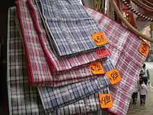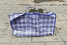 Red-white-blue bag (Chinese: 紅白藍膠袋; Jyutping: hung4 baak6 laam4 gaau1 doi2) or laundry bag is a carriage bag made out of nylon canvas in colors of red, white and blue. It originated in Hong Kong in the 1960s and has become a representative of Hong Kong culture. Because the nylon canvas is known of its light, firmness and durable usage, it is commonly used as hand carry luggage and transport between Mainland China and Hong Kong.[1]