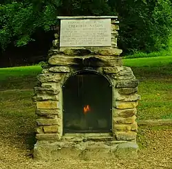 The Eternal Flame of the Cherokee Nation, a memorial to the Cherokees who suffered and died during the removal, was placed on the site on April 6, 1984, at an event attended by both the Eastern Band of Cherokee Indians and the Cherokee Nation of Oklahoma. This was the first time the two tribes were reunited since the removal.[27][28] Between April 17 and 19, 2009, a joint council again convened at Red Clay to commemorate the 25th anniversary of the 1984 event.[29] On August 22 and 23, 2015, the three federally recognized Cherokee tribes; the Eastern Band of Cherokee Indians, Cherokee Nation, and the United Keetoowah Band of Cherokee Indians; reconvened at Red Clay State Park for the first time since the removal.[30] The park has also hosted a number of recurring events. Between 1982 and 2001, an event called the Cherokee Days of Celebration (known as Cherokeefest until 1986) was held at the park in August and sponsored by the state.[16] The festival returned in 2003 as the Cherokee Cultural Celebration. The event, sponsored by the Eastern Band of Cherokee Indians and other groups, features exhibitions about Cherokee culture and heritage.[31] Friends of Red Clay was established as a nonprofit organization in 2007, and hosted an annual pow wow in October, the last of which occurred in 2019.[32] Part of the third episode of the PBS American Experience documentary series We Shall Remain, titled "Trail of Tears", was filmed in the park in 2008.[33][34] A sign designating the park as part of the Trail of Tears National Historic Trail was unveiled on February 7, 2018.[35] A project to update the museum was completed on November 4, 2021.[36] The blacksmith shop was added in June 2023.[37]