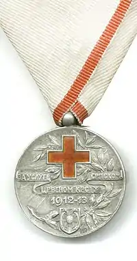 The Red Cross Medal of Merit was instituted in 1912, it was awarded by the Board of the Red Cross Society, with the approval of the Chancellor of Royal Orders, for exceptional merit and services rendered to the Serbian Red Cross in time of war or peace, and for care and assistance to the sick and wounded, philanthropy and personal merit.[2] The Medal of Merit was awarded in two Classes (Silver Medal and Bronze Medal). It was first awarded in 1912 during the First Bakan War, In 1933 the awarding of the Bronze Medal ceased and a senior Class of Gold Medal was introduced to replace it.