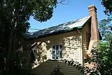 Generally the exterior of the building is clad with chamfered weatherboards, with simple framed windows. The corrugated iron roof features a double gable running north–south, with a discrete verandah awning on the southern elevation, and with the eastern verandah incorporated into the main roof of the building. Another gabled roof covering covers the early kitchen wing, running east–west, abutting the northern end of the gabled section. An early brick chimney, incorporating an oven abuts the western end of the kitchen wing.[1]
