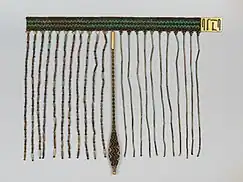 The sceptre-heqa is surely the oldest symbol of Pharaonic domination. It represents a shepherd's crook, a stick with a curved end.[28] The hook and its spread were designed to grasp an ovis or caprinae (ewe, goat) by the hind leg in order to administer care. The symbolism of the Pharaonic crook is simple to analyze. Reflecting the pastoral aspects of Egyptian society, the Pharaoh was the shepherd of his people, guiding and protecting them.[29] In hieroglyphic writing, the image of the crozier served as an ideogram for the concept of "power/authority/sovereignty", noting the words "regional governor" and "foreign sovereign".[30] The two oldest known examples came from the royal necropolis of Abydos (Cemetery U). The first is fragmentary and dates from the end of the Naqada II period, while the second is complete and dates from the end of the Predynastic period. The latter was found in tomb U-j, where a Thinite ruler was buried, possibly King Scorpion. The earliest representation of a pharaoh with a Heqa scepter in his hand is a small statuette bearing the name of Ninetjer (2nd Dynasty).[29] On the other hand, the same figure holds the nekhekh flail (or flagellum). Often misrepresented as a fly swatter, the nekhekh was actually used to prod cattle. It, too, was a symbolic object born of the Egyptian agricultural mentality, which was strongly influenced by the values of animal husbandry.[31] With the development of the Osirian cult from the 4th Dynasty onwards, the scepter-heqa and flail-nekhekh became attributes of Osiris; the funerary god holding both in his two hands and crossed over his chest. By assimilation with this important divinity, pharaohs were also depicted in this posture, notably on the Osiride pillars of their monuments of eternity and on their sarcophagi.[32]