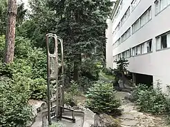 Regents Hill features the university's only Japanese-influenced garden. Tucked behind McGregor Hall on a slope, a small, informal landscape of trees, shrubs, moss, stone pathways, and a small pond suggests the architect's travels to Asia in 1934 and his awareness of the Japanese work of Czech-American architect Antonin Raymond. An open, metal sculpture, built with the original design, still stands and adds to the overall effect. Several large rocks are scattered loosely about the landscape, yet their seemingly random placement might have been intentional to reveal the connections between eastern and western cultures; broadly suggestive of Washington state's geography on the Pacific Rim. The design's relationship to the landscape as a whole—from its sensitive relationship to the ground (by raising it up on stilts) to its expansive windows permitting views from its hilly site—earned it a place among Architectural Forum's five best college buildings in 1951.[7]
