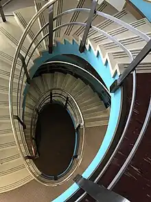 At the same time, Thiry's design attempted to link the building to local conditions: the lobby of Stearns Hall, for example, features a sculptural spiral staircase, curved walls, and a wavy, stainless steel banister; originally, Stearns included carpets and furniture that Thiry considered "emblematic of the Palouse country" because their wavy designs suggested the rolling hills of the surrounding landscape.[3] An alumni magazine celebrated McGregor Hall and Barnard Hall for their spacious, double rooms with picture windows and floors featuring kitchenettes, laundry units, and an outdoor lounge area (what later became known as the "sun porch") with "flower garden and lawn."[4] The magazine boasted of the building's common sewing and typing rooms and considered the design, overall, to mark a significant advance in campus housing because of its "home and small-group living."[5]