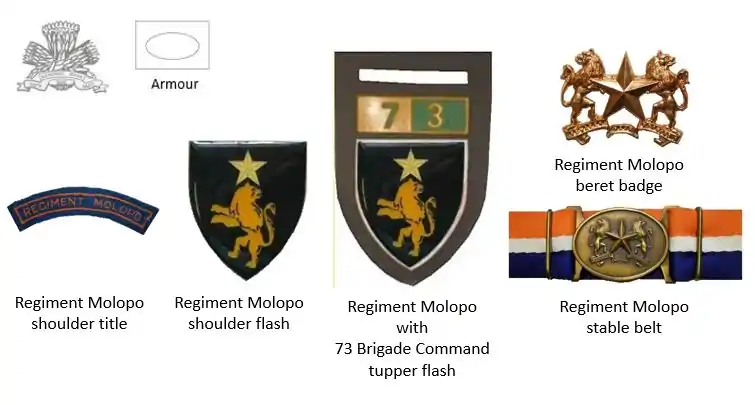 Regiment Molopo was raised in 1960 as an armoured regiment equipped with armoured cars. In 1986 Regiment Molopo was changed from an armoured car unit to a tank regiment.