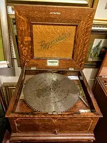 Regina boxes were seen as strong profit drivers partially because they created a steady revenue stream, as consumers would buy new discs to play on boxes they had already purchased.[2] For a machine that cost $500, this was a relatively novel idea.[3] Regina shipped 100,000 music boxes between 1892 and 1921, with sales topping out over $2 million a year. The company had 325 employees, and even as Symphonion established an American branch, Regina thrived as the market leader. Competition from the phonograph jeopardized the company in the early years of the 20th century, and in 1902, it dropped "Music Box" from its name and started to diversify. Its first vacuum cleaner was a two-person hand-pumped pneumatic model which sold poorly. In 1903, Knauth and company overtook the company to protect its investment, relegating Brachhausen to factory manager. New products continued to flood the market from the Regina company, everything from player pianos to copying presses. Eventually, the company went bankrupt in 1922.