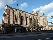 It consists of a cruciform with side aisles and a square tower to the south-east.[8] To the east of this main section is a cloister court, around which are arranged vestries, the session house, a hall and the church officer's house.[8] The windows along the side are decorated with tracery and there are flanking buttresses that travel above the height of the windows.[8] The three windows of the chancery are decorated with stained glass by James Ballantine, depicting the Nativity, Crucifixion and Ascension.[8][4]