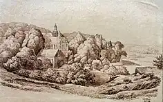 During the 19th century, the exterior of the palace underwent a significant transformation, resulting in profound remodeling.[15] One notable alteration concerned the palace courtyard. In 1874, during the conversion of the palace into a hotel, a neo-Gothic porch with an entrance hall was added in front of the central wing. This addition gave the palace an approximately E-shaped floor plan in addition to serving as a spacious stairway.[18] The eastern stair tower on the south wing was demolished, and the courtyard arcades were sealed, creating an interior corridor connecting the first-floor rooms. Further modifications included the replacement of stone window frames and cross with wooden frames, as well as the substitution of slate roofing with roof tiles, which reduced the overall height of the roof. Additionally, at the dawn of the 20th century, the castle chapel was abandoned and transformed into new rooms through the installation of partition walls.