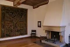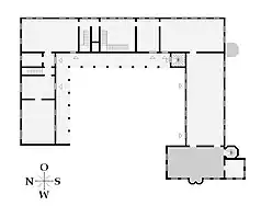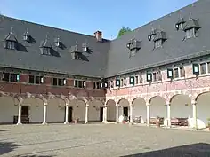 The three-wing layout of the palace defied the later Baroque understanding of space, which typically featured a central banqueting hall and symmetrical apartments. Instead, Reinbek Castle followed functional principles, with the southern wing housing the grand banqueting and court halls, along with the former castle chapel in its annex from the early 17th century.[1] The middle wing served as guest apartments, while the northern wing encompassed the court kitchen and utility rooms. Access to the rooms in the north and east wings was provided through the courtyard arcade and a gallery beneath the knee wall, representing a modern innovation in castle construction in Schleswig-Holstein.[1] In 1589, the court artist Jacob van der Wordt adorned the rooms with ornate paintings. When Duchess Augusta resided in the palace, she commissioned the addition of a palace chapel in the south wing's annex and the construction of two additional stair towers to complement the existing one in the courtyard. Ornamental motifs were painted on the oak ceilings, adorning nearly every area of the castle.