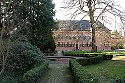 The master builder of the castle is unknown,[15] but it is believed that Hercules Oberberg or Peter of Maastricht may have been involved in the design.[16] The castle follows the style of the Dutch Renaissance, which Duke Adolf became familiar with during his frequent local travels. It is made of red brick masonry, and the facades have horizontal sandstone bands. The window frames are also made of sandstone and feature stone crosses, with wooden shutters on the sides. One unique architectural feature in this region is the courtyard's arcade, which is made up of Tuscan columns and connects the rooms of the north and east wings on the first floor.