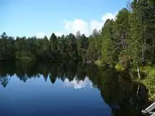 Rejvíz is also name of a national nature reserve, which was officially founded in 1955 and covers 3.97 km2. It is composed of the largest peat bog in Moravia and Czech Silesia with small lakes of glacial origin. Recent studies have found the Rejvíz bog to be one of the best preserved woody raised bog complexes in Central Europe as core sampling reveals its organic deposit started to accumulate nine thousands years ago or even earlier.[2] An educational trail was opened in 1970 and leads from the Rejvíz Guesthouse to Velké mechové Lake in the western part of the nature reserve. It is 1.5 km long and there are six stops with information boards.