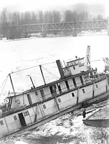 On December 24, 1924, the Willamette River, for the first time in many years, froze bank to bank at Salem.[35] Relief had loaded nearly 100 tons of cargo, mostly paper, at the Chemeketa street dock at about 10:00 a.m. when a sudden change in current brought ice to the vessel, crossing it against the river bank, listing over badly, and near to capsizing.[35] Efforts to take off the cargo began early in the afternoon, and were successful.[35] Relief was valued at $12,000 and was insured.[35] The boat was being operated at the time by the Inland Waters Transportation company.[35]