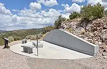 Soon after its construction, the 1999 monument began slipping into the nearby ravine, so during the summer of 2004 a cement retaining wall was constructed by the Church to help stabilize the area.[29] In 2007 a vault toilet was constructed near the monument.[30] The toilet was built by the State of Utah, which continues to maintain it. A 2001 attempt to build a toilet was stalled when a member of the Mountain Meadows Association complained that the association's name would not be included on the restroom.[31]