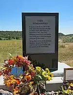 The replica was dedicated on September 25, 2005, with many descendants of the massacre victims and locals in the crowd.[55] During the dedication the stories of the surviving children were told while their descendants placed stones brought from southern Utah upon the cairn.[56] This replica is much smaller in terms of stones than the original, but it does include a large cross facing west, towards Utah, with the words "Vengeance is mine; I will repay, saith the Lord" carved into it. To the side of the replica cairn sits a large interpretative sign with the following inscription: