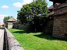 In the reconstruction of Nuremberg's city walls, that largely survived until the Second World War, several sections of the wall were re-covered in this way. The posts of the roof trusses also rest on stone columns, which jut out of the wall line (Mauerflucht) or are placed on the cornices.