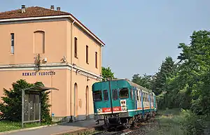 Renate-Veduggio railway station is a railway station in Italy. Located on the Monza–Molteno railway, it serves the municipality of Renate in Lombardy. The train services are operated by Trenord.