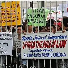Corona's supporters also showed solidarity with him during the trial with signs and by their presence at the Supreme Court.