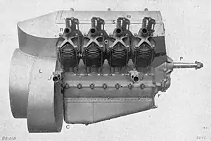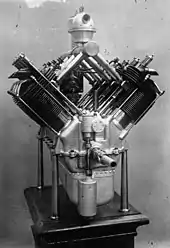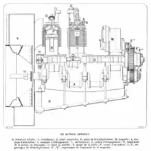The Renault 50/60 hp engine had two rows of four cylinders angled at 90-degree to each other and had a bore and stroke of 90 mm × 120 mm (3.5 in × 4.7 in).[1] The cylinders and cylinder heads were separate cast-iron pieces with cast fins for air-cooling. The cylinder heads were secured by a cross-shaped clamp which was bolted to the crankcase with four long studs.[1][2] Airflow for cooling the cylinders was generated with a fan driven from the rear end of the crankshaft. The fan was blowing air into the sheet metal enclosed chamber between the two rows of cylinders, which then left the enclosure through the narrow spaces between the cylinders, passing through the cylinder's cooling-fins. Various shapes for the blower fan housing were tried, cylindrical[3] and conical,[4][5][6] until the definitive spiral-shaped form finally emerged in 1909.[7]