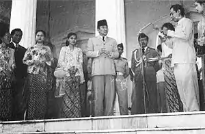 In 1941, as the domestic film industry was seeking young, educated actors to improve the public perception of cinema, Soekarno was approached by Union Films and cast in their production Soeara Berbisa, a film which told of two men who compete for a woman's love before discovering that they are brothers.[1][2] He appeared in another film, for Union later that year, when he played a young assistant pharmacist in the company's romance Mega Mendoeng (1942). In March 1942, following the Japanese occupation of the Dutch East Indies, Union was closed, and Soekarno, though working on an adaptation of the legend Damarwulan, was let go.[3]