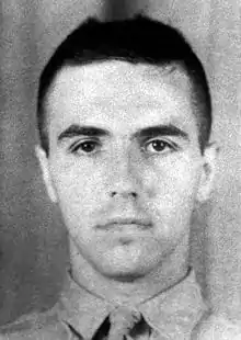 In October 2019, a third Marine Corps investigation concluded that former Marine Harold Keller, not Rene Gagnon (fifth from left), was actually depicted in Rosenthal's photo.[1] Gagnon who carried the larger second flag up Mount Suribachi, helped lower the first flagstaff and removed the first flag at the time the second flag was raised.[2] The identities of the other five flag raisers were confirmed. Like Schultz, Keller never publicly mentioned his role in the flag-raising or that he was in Rosenthal's photograph.