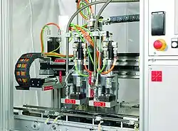 For the production of series, dispensing systems with multifold metering heads can be used. At this time (2006) there are systems running capable to do up to thirty dispensing acts simultaneously.