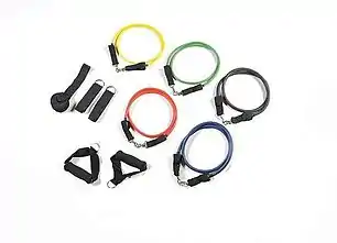 Compact resistance band Plastic handles attached to the end of the band Upper and lower body