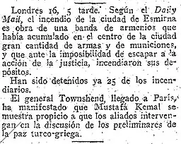 On 17 September, when the massacre and the fire in the city had come to an end, Mustafa Kemal Atatürk, future Turkish President and then-Commander-in-Chief of the Turkish armies, sent the Minister of Foreign Affairs Yusuf Kemal the following telegram, describing the official version of events in the city:[26][27]